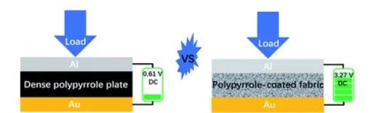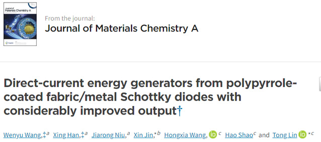 开云足球纺织科学与工程学院王闻宇副教授和林童教授课题组在纳米发电机直流发电集成化研究领域取得重要进展,相关成果以“Direct-current Energy Generators from Polypyrrole-coated Fabric/Metal Schottky Diodes with Considerably Improved Output”为题,发表在国际期刊《Journal of Materials Chemical A》(影响因子为11.3),王闻宇副教授与纺织科学与工程学院的博士生韩幸为该论文的共同第一作者。