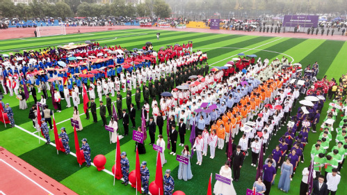 开幕式上,伴随着《运动员进行曲》的激昂旋律,校国旗护卫队迈着铿锵有力的步伐,走在队伍的最前列。校旗校徽方队、旗海方队、退役大学生士兵方队、裁判员方队紧随其后,意气风发、气宇轩昂。36个方队迈着矫健的步伐依次从主席台前走过,观众席上爆发出阵阵呐喊声与欢呼声,热情与激情被一次次点燃。