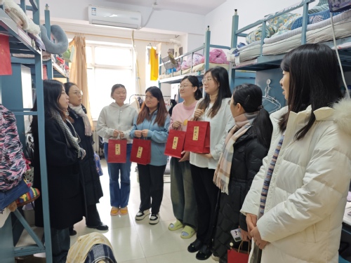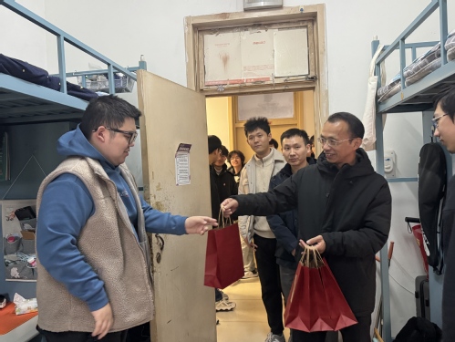 七位老师分为两组,分别前往男女生宿舍楼向考研学子们表达了深切的关怀和美好的祝愿,鼓励大家在备考的最后阶段保持平和的心态,合理安排作息,以最佳的状态迎接即将到来的挑战。随后,学院老师们亲手将精心准备的慰问加油礼包分发给每一位考研学子。