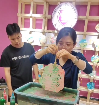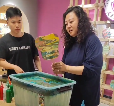 在漂漆工艺区,一场色彩盛宴悄然上演。老师们将宣纸扇轻缓且匀速地浸入漆液,凭借细腻腕力精准把控提拉速度与幅度。当扇子缓缓提出水面,原本素朴的白扇面瞬间幻化为色彩绚烂、纹理渐变的艺术佳作,引得现场惊叹连连。这种沉浸式体验,让老师们真切感受到非遗漂漆工艺的独特魅力与无穷创意。